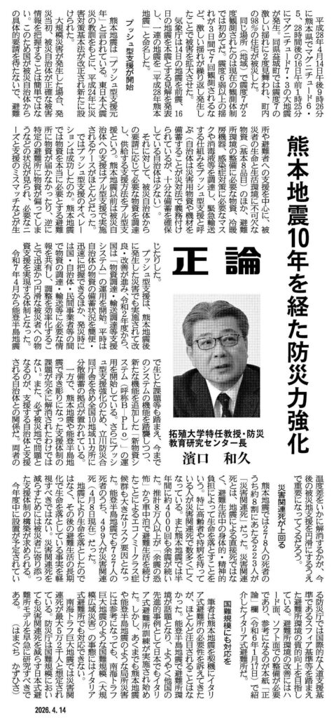協会理事長濱口和久の産経新聞「正論」記事「熊本地震10年を経た防災力強化」を学んでください。