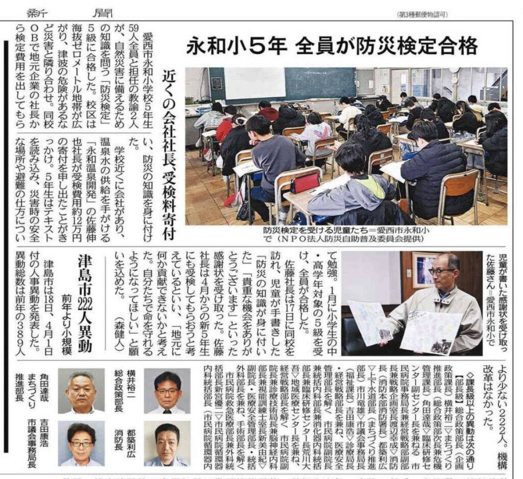永和小5年 全員が防災検定合格 投稿日 2026年3月19日 著者 事務局 カテゴリー お知らせ 3月19日中日新聞の掲載記事です。一般財団法人 防災教育推進協会と提携しているNPO法人自助普及委員会さんのとりくみ記事です。
