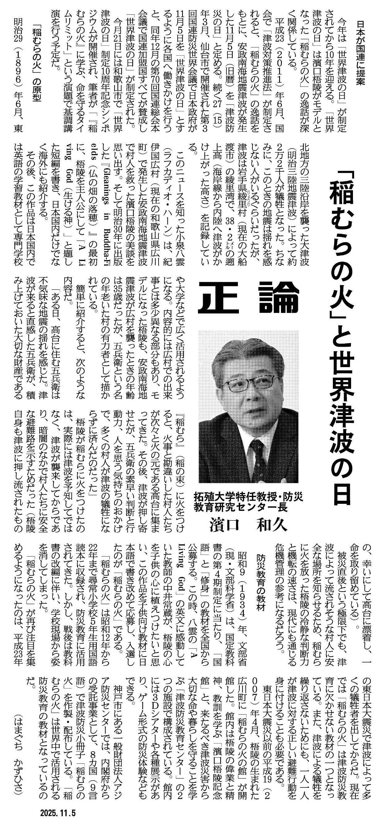 11月5日は日本が国連に提案して制定された『世界津波の日』です。 投稿日 2025年11月5日 著者 事務局 カテゴリー お知らせ <正論>「稲むらの火」と世界津波の日 拓殖大学特任教授、防災教育研究センター長・濱口和久 ≪日本が国連に提案≫www.sankei.com